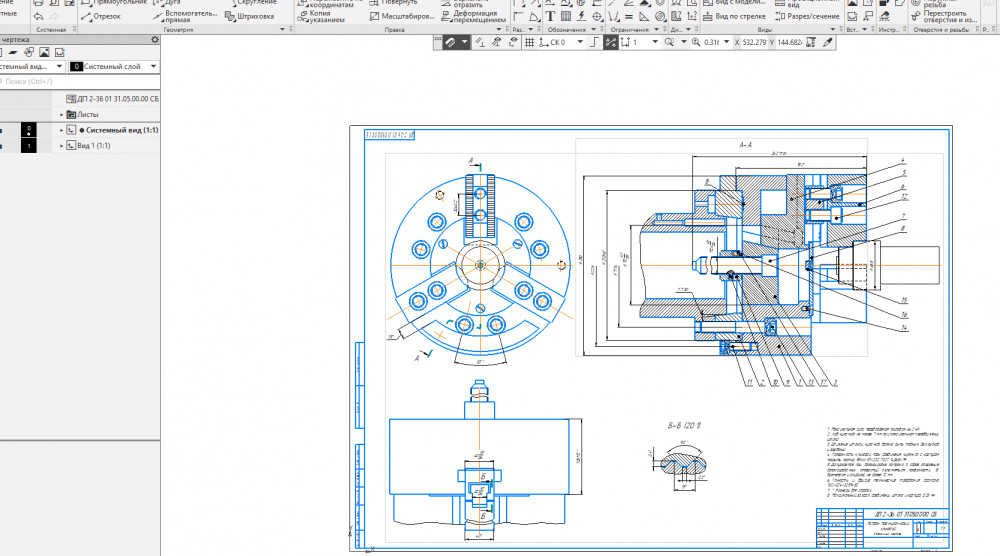 Для студентов МГТУ им. Н.Э.Баумана по предмету Технология производстваЧертёж - Патрон трехкулачковый клиновойЧертёж - Патрон трехкулачковый клиновой