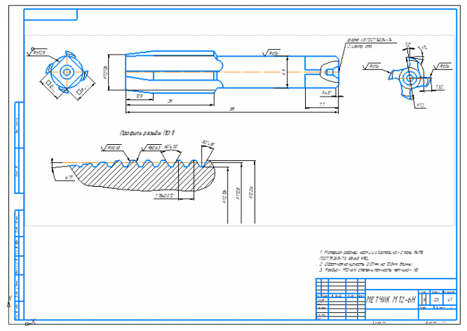 Для студентов МГТУ им. Н.Э.Баумана по предмету Технология производстваЧертёж - Метчик М12 х 1,75 Р6М5Чертёж - Метчик М12 х 1,75 Р6М5