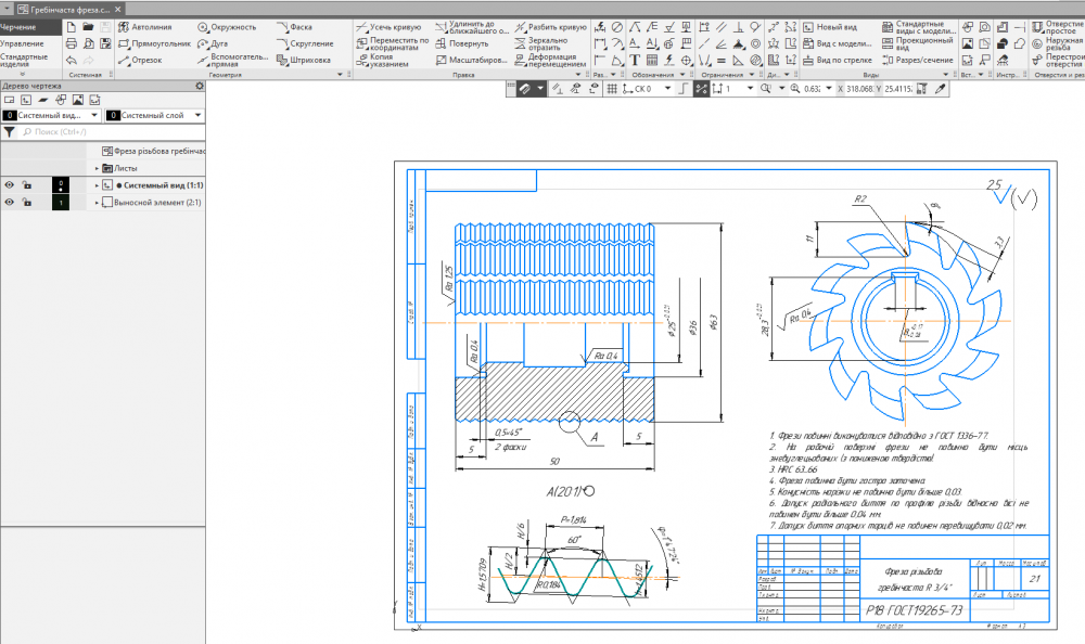 Для студентов МГТУ им. Н.Э.Баумана по предмету Технология производстваЧертёж - Фреза гребенчатая R 3/4 Р18Чертёж - Фреза гребенчатая R 3/4 Р18