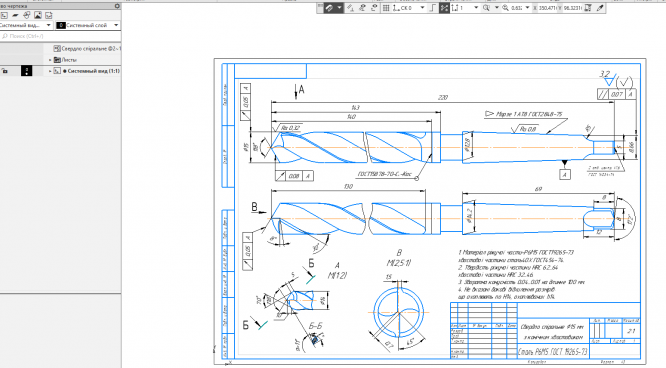 Для студентов МГТУ им. Н.Э.Баумана по предмету Технология производстваЧертёж - Сверло спиральное с коническим хвостовиком D=15, Р6М5Чертёж - Сверло спиральное с коническим хвостовиком D=15, Р6М5
