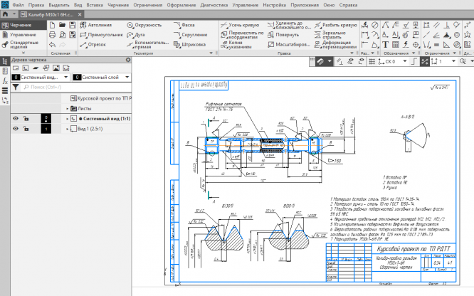 Чертёж - Калибр пробка резьбовая ПР НЕ М30 х1-6H сборочный чертеж в компасе А3