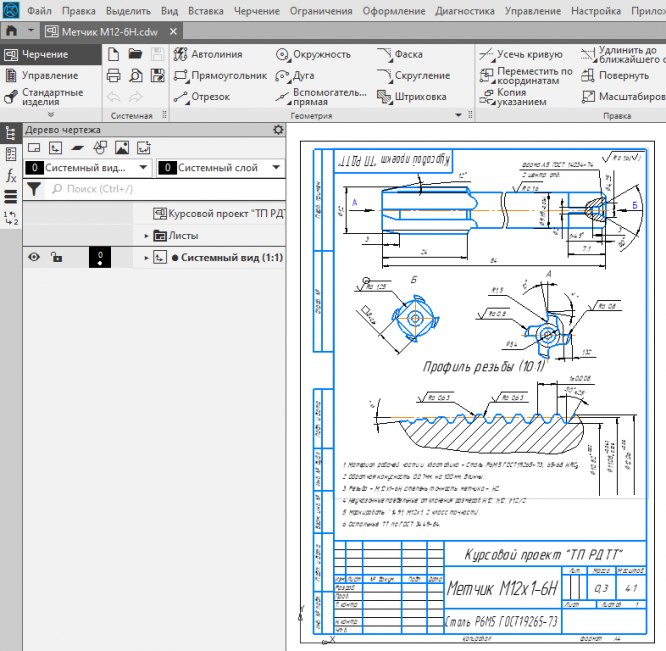 Для студентов МГТУ им. Н.Э.Баумана по предмету Технология производстваЧертёж - Метчик М12х1 Р6М5Чертёж - Метчик М12х1 Р6М5