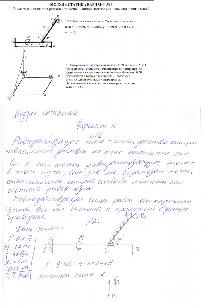 - Найти усилие в шарнире C и момент в заделке A, если Р = 10 кН, M = 8 кНм, q = 4 кН/м (AB и BC в метрах).