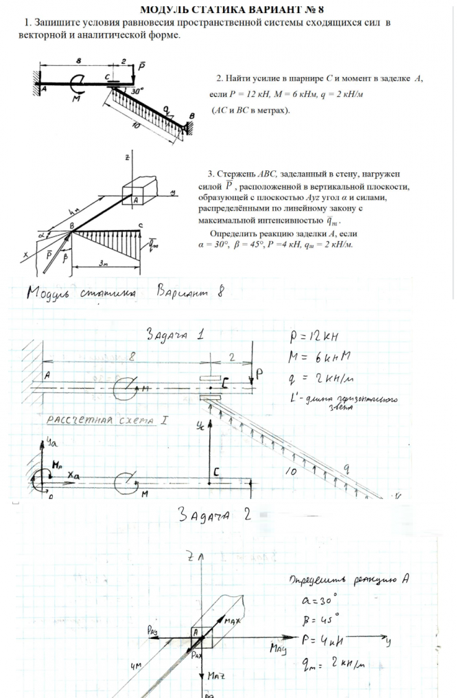 - Найти усилие в шарнире C и момент в заделке A, если Р = 12 кН, M = 6 кНм, q = 2 кН/м (AC и BC в метрах).