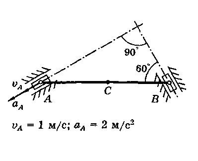 Для представленных на схемах 1 - 30 механизмов, состоящих из шатуна АВ длиной 2 м и двух ползунов, по заданным величинам скорости и ускорения ползуна А определить скорость и ускорение ползуна В и средней точки С шатуна, а также угловую скорость и угловое ускорение шатуна.