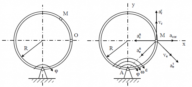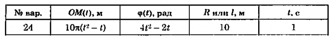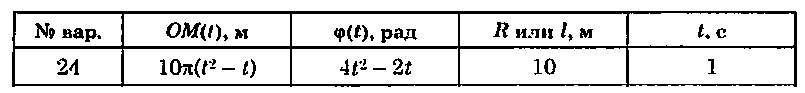 В приведенных ниже схемах 1 - 30 рассматривается движение точки М в желобе вращающегося тела. По заданным в таблице уравнениям относительного движения OM(t), переносного движения φ(t) и геометрическим размерам определить абсолютную скорость и абсолютное ускорение точки в указанный момент времени.