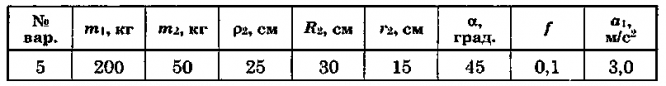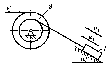 Для приведенных на схемах 1 - 30 механических систем, используя принцип Даламбера, определить величину силы F, необходимую для перемещения груза с заданным ускорением а1, а также усилие в грузовом тросе. Исходные данные: массы груза m и барабана m2, радиус барабана R2 (у двойного барабана имеется также г2), его радиус инерции ρ2 (если он не указан, тело считать однородным цилиндром), угол α и коэффициент трения скольжения f приведены в таблице. Непронумерованные блоки и катки считать невесомыми. Трением на осях барабана и блоков пренебречь.
