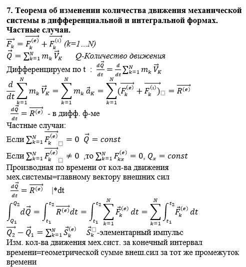 7. Теорема об изменении количества движения механической системы в дифференциальной и интегральной формах. Частные случаи.