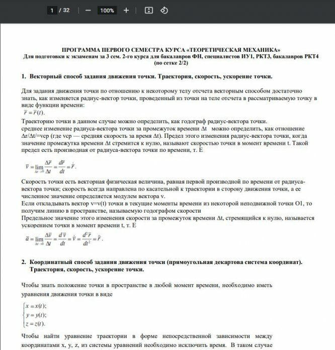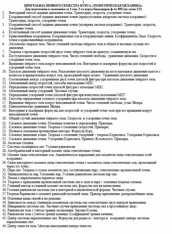 ПРОГРАММА ПЕРВОГО СЕМЕСТРА КУРСА «ТЕОРЕТИЧЕСКАЯ МЕХАНИКА»