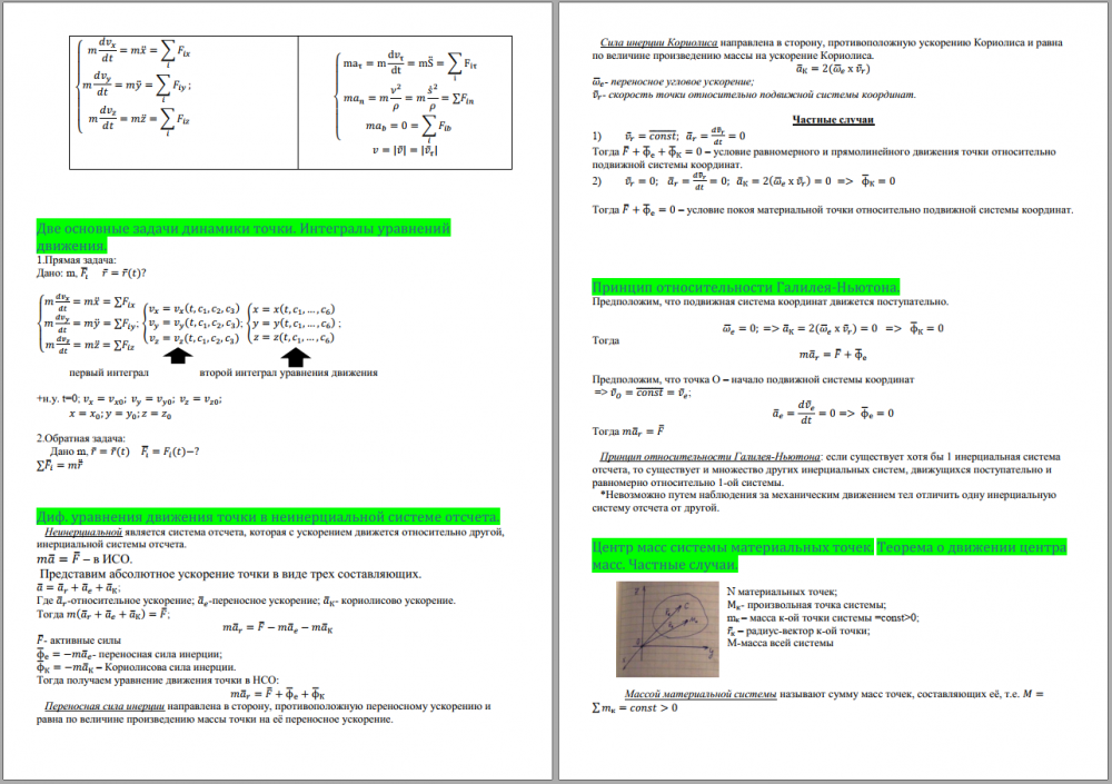1.      Аксиомы динамики. Инерциальная система отсчета. 2.      Дифференциальные уравнения движения точки в векторной форме и в проекциях на декартовы и естественные оси координат. 3.      Две основные задачи динамики точки. Интегралы уравнений движения. 4.      Диф. уравнения движения точки в неинерциальной системе отсчета. 5.      Принцип относительности Галилея-Ньютона. 6.      Центр масс системы материальных точек. Теорема о движении центра масс. Частные случаи. 7.      Теорема об изменении количества движения механической системы в дифференциальной и интегральной формах. Частные случаи. 8.      Диф. уравнения поступательного движения твердого тела. 9.      Кинетический момент точки и системы материальных точек относительно центра и оси.