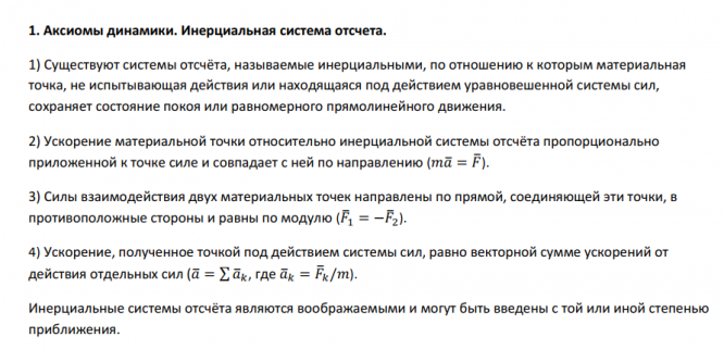 1. Аксиомы динамики. Инерциальная система отсчета. 1) Существуют системы отсчёта, называемые инерциальными, по отношению к которым материальная точка, не испытывающая действия или находящаяся под действием уравновешенной системы сил, сохраняет состояние покоя или равномерного прямолинейного движения. 2) Ускорение материальной точки относительно инерциальной системы отсчёта пропорционально приложенной к точке силе и совпадает с ней по направлению ( 𝑚𝑎̅ = 𝐹̅ ). 3) Силы взаимодействия двух материальных точек направлены по прямой, соединяющей эти точки, в противоположные стороны и равны по модулю ( 𝐹̅ 1 = -𝐹̅ 2 ). 4) Ускорение, полученное точкой под действием системы сил, равно векторной сумме ускорений от действия отдельных сил ( 𝑎̅ = ∑ 𝑎̅ 𝑘 , где 𝑎̅ 𝑘 = 𝐹̅ 𝑘 /𝑚 ).