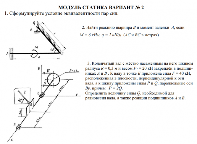 Сформулируйте условие эквивалентности пар сил. Найти реакцию шарнира B и момент заделки A, если M = 6 кНм, q = 2 кН/м (AC и BC в метрах). Коленчатый вал с жёстко насаженным на него шкивом радиуса R = 0,3 м и весом Р1 = 20 кН закреплён в подшипниках А и B . К валу в точке E приложена сила F = 40 кН, расположенная в плоскости, перпендикулярной к оси вала, а к шкиву приложены силы P и Q, параллельные оси Bу, причем Р = 2Q. Определить величину силы Q, необходимой для равновесия вала, а также реакции подшипников A и B..