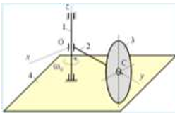 Кривошип 2 вращается с постоянной угловой скоростью вокруг вертикальной оси 2. Диск 3 при этом катится по без скольжения по неподвижной плоскости 4. Разложите движение диска на два вращательных движения, связав подвижную систему координат Oxyz с кривошипом. Как направлено кориолисово ускорение точки М диска, лежащей в плоскости Oyz?