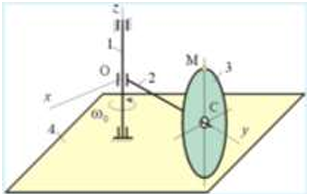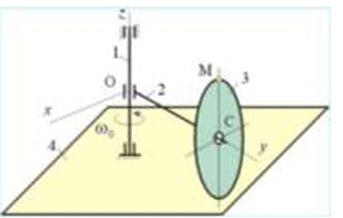 Кривошип 2 вращается с постоянной угловой скоростью вокруг вертикальной оси 1. Диск 3 при этом катится по плоскости 4 без скольжения. Каков угол α между осестремительным и вращательным ускорением точки М?