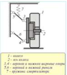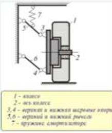 На схеме изображена упрощенная схема подвески переднего колеса автомобиля. Какое движение совершает переднее колесо относительно кузова при криволинейном движении автомобиля по неровной дороге?