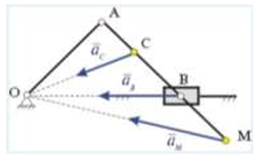 Ускорения трех точек В, С и М шатуна АМ направлены, как указано на рисунке. Каким является вращение кривошипа ОА, если ОА = АВ, а указанное направление ускорений имеет место при любом положении механизма? Кривошип вращается против часовой стрелки.