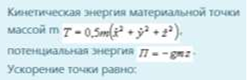 Кинетическая энергия материальной точки массой m T = 0,5m (x`² + y`² + z`²), потенциальная энергия П = – gmz. Ускорение точки равно: