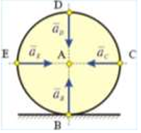 Колесо катится по прямолинейному рельсу так, что ускорения его точек, лежащих на ободе, направлены к центру колеса. Как движется центр колеса, если его скорость направлена вправо?