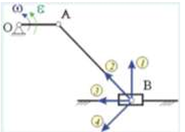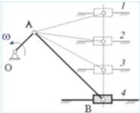 Определить знак угловой скорости звена АВ относительно звена ОА в положении механизма, изображённом на рисунке. Звено ОА вращается в направлении, указанном стрелкой, ускоренно. Угол между звеном ОА и звеном АВ равен 90 о. Звено АВ вставлено