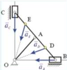Кривошип ОА, вращающийся вокруг неподвижной оси О, приводит в движение линейку ВС, связанную с ползунами В и С, перемещающимися по прямолинейным направляющим. Ускорения точек линейки распределены так, как указано на рисунке, причем это распределение имеет место при любом положении механизма. Как вращается кривошип ОА, если ОА = АВ = АС?