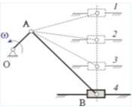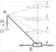 Кривошипно-ползунные механизмы отличаются длиной шатуна. Кривошип ОА вращается с постоянной угловой скоростью. В каком из механизмов угловое ускорение шатуна АВ в данный момент наибольшее по абсолютной величине?