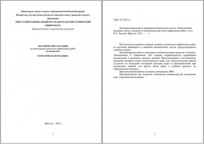 Изучение равновесия и движения механических систем. Теоретическая механика: метод. указания по выполнению расчетно-графических работ / сост.: В.Л. Лапшин. Иркутск, 2025. – с..