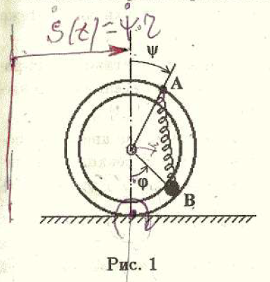 Круглая трубка, имеющая форму колеса радиуса R, катится без проскальзывания в вертикальной плоскости по неподвижной горизонтальной направляющей. В трубке находится шарик В массы m, соединенный пружиной с точкой А трубки (рис. 1). Длина недеформированной пружины равна 2R, жесткость пружины c. Масса колеса равномерно распределена по его ободу и равна M. Трением шарика о трубку пренебречь.