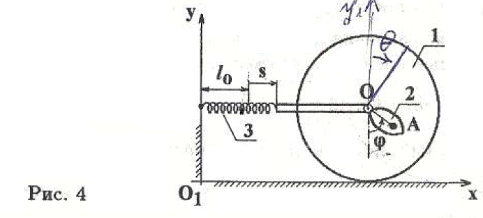 Однородный круглый цилиндр 1 массы m1 и радиуса R катится без скольжения по горизонтальной неподвижной плоскости (рис. 4). К нему приложена пара сил с моментом М=М0cosωt. К оси цилиндра шарнирно прикреплен физический маятник 2 массы m2. Момент инерции маятника относительно оси, проходящей через точку О перпендикулярно основанию цилиндра, равен I0. Центр масс маятника находится в точке А на расстоянии ОА=h. Точка О соединена горизонтальной пружиной 3 с неподвижной опорой. Жесткость пружины равна c, l1 — длина недеформированной пружины.