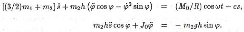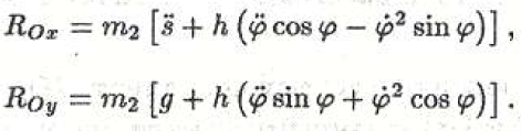 • 12. Задавая численные значения параметров и начальные условия: m1=40кг; m2=10кг; R=0,1м; h=0,06м; I0=0,04кг*м2; M0=39,2Н*м; ω=πc-1; t0=0; s0=0; φ0=0,5; s`0=φ`0=0, составить программу решения системы дифференциальных уравнений и на ЭВМ построить зависимости s(t), φ(t), ROx(t), ROy(t).