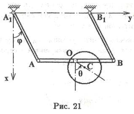 Однородный диск радиуса r и массы m1, прикрепленный шарниром к середине стержня AB, качается в вертикальной плоскости около горизонтальной оси O, перпендикулярной плоскости рисунка (рис. 21). Стержень АВ длины l и массы m2 подвешен на двух параллельных невесомых стержнях АА1 и ВВ1одинаковой длины l, которые качаются в одной плоскости с диском. Трением в шарнирах пренебречь. Расстояние от шарнира O до центра масс диска равно OC=b. К диску приложен момент сопротивления M=-kθ`, k=const, пропорциональный угловой скорости.