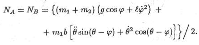 • 12. Задавая численные значения параметров и начальные условия: m1=5кг, m2=5 кг, r=0,25м, l=1м, b=0,125м, k=10Н*м*с, t0=0, φ0=π/2, θ0=π/2, φ0`=0, θ0`=0, составить программу решения системы дифференциальных уравнений на ЭВМ построить зависимости φ(t), θ(t), NA(t).
