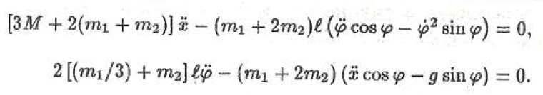 • 12. Задавая численные значения параметров и начальные условия: m1=1кг, m2=2кг, M=10кг, l=1м, t0=0, φ0=π/6, x0'=0,5 м/с, φ0'=0, составить программу решения системы дифференциальных уравнений и на ЭВМ построить зависимости x(t), φ(t), N(t).