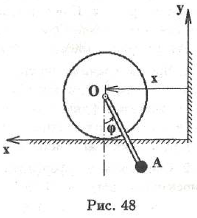 Однородный диск массы M катится без скольжения по прямолинейному рельсу. К центру диска шарнирно прикреплен однородный стержень длины l и массы m1, на конце которого находится точечный груз А массы m2 (рис, 48).