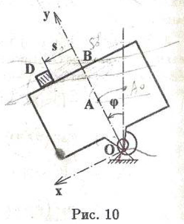 Твердое тело массы М удерживается с помощью цилиндрического шарнира O и спиральной пружины жесткости C(рис. 10). Центр тяжести тела находится в точке А, где OА=a, OВ=b. Когда OA находится на вертикали, пружина не напряжена. Момент инерции тела относительно горизонтальной оси О, перпендикулярной плоскости рисунка, равен I0. По поверхности тела движется точка D массы m, при перемещении которой возникает сила сопротивления F=-ks`, k=const, пропорциональная относительной скорости точки.