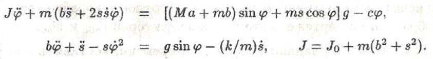 • 12. Задавая численные значения параметров и начальные условия: M=50кг, m=20кг, a=1м, b=1,5м, I0=100кг*м2, c=104Н*м, k=50Н*с/м, t0=0, φ0=π/20, s0=0, φ0`=s0`=0, составить программу решения системы дифференциальных уравнений и на ЭВМ построить зависимости φ(t), s(t), N(t).
