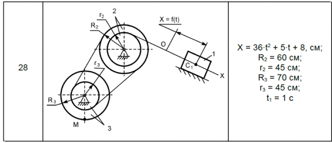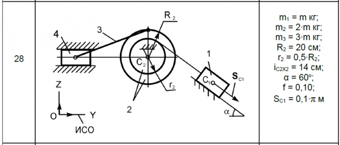 Пренебрегая силами сопротивления и массами нитей, предполагаемых нерастяжимыми, определить скорость центра масс C1 тела 1 в тот момент времени, когда пройденный путь им станет равным SC1.
