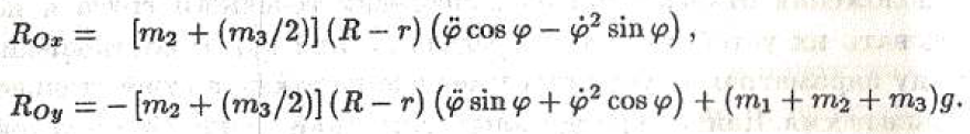 • 3. Считая θ(t) и φ(t) заданными функциями времени, найти проекции ROx и ROy реакции шарнира О. Применить теорему о движении центра масс. Показать, что