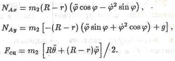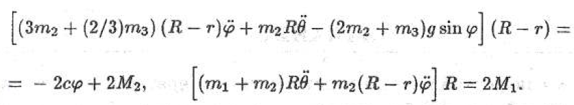 • 12. Задавая численные значения параметров и начальные условия: m1=2кг, m2=1кг, m3=1кг, R=1м, r=0,2м, с=2Н/м, M1=0,5Н*м, M2=0,2Н*м, t0=0, θ0=π/2, φ0=π/6, θ0`=2с-1, φ0`=0, составить программу решения системы дифференциальных уравнений и на ЭВМ построить зависимости θ(t), φ(t), NAx(t), NAy(t).
