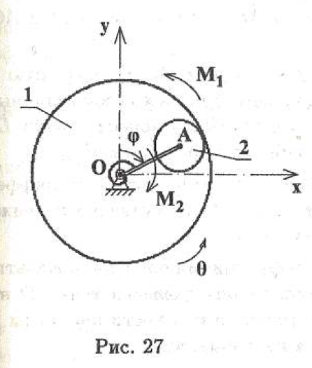 Зубчатое колесо m2 массы те, и радиуса находится во внутреннем зацеплении с зубчатым колесом 1 массы m1 и радиуса R, вращающимся вокруг неподвижной горизонтальной оси O под действием постоянного момента М1. Кривошип ОА массы m3 в точке О насажен на ту же ось, а в точке А шарнирно соединен с центром колеса 2 (рис. 27). К кривошипу приложен постоянный момент M2 и упругий момент спиральной пружины жесткости с. При φ=0 пружина не деформирована.