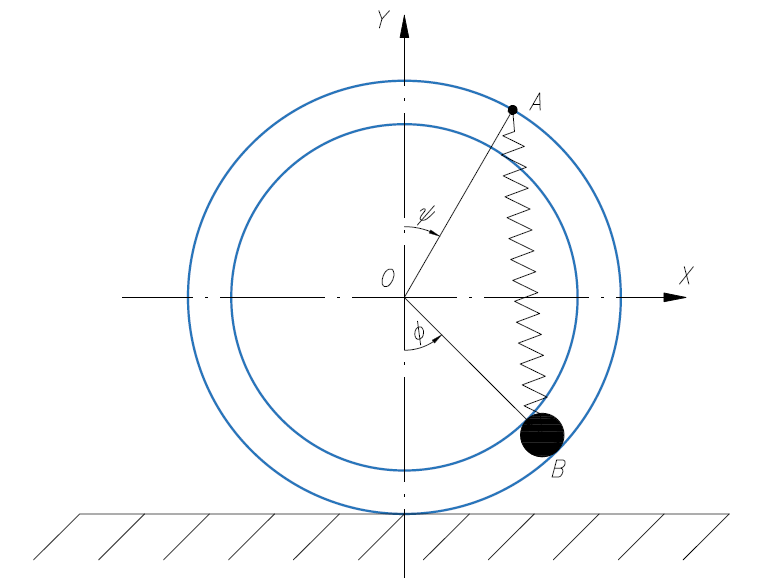 Круглая трубка, имеющая форму колеса радиуса R, катится без проскальзывания в вертикальной плоскости по неподвижной горизонтальной направляющей. В трубке находится шарик В массы m, соединенный пружиной с точкой А трубки (рис. 1). Длина недеформированной пружины равна 2R, жесткость пружины c. Масса колеса равномерно распределена по его ободу и равна M. Трением шарика о трубку пренебречь.