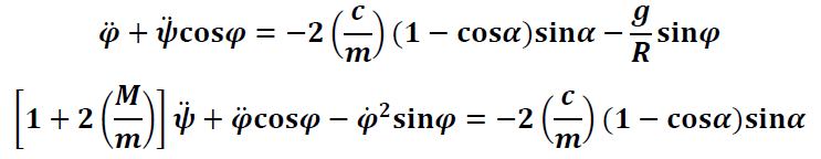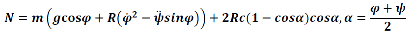 • 12. Задавая численные значения параметров и начальные условия: m=2кг, M=1кг, R=1м, c=40 Н/м, t0=0, φ0=π/3, ψ0=0, φ`0=ψ`0=0 составить программу решения системы дифференциальных уравнений и на ЭВМ построить зависимости φ(t), ψ(t), N(t).