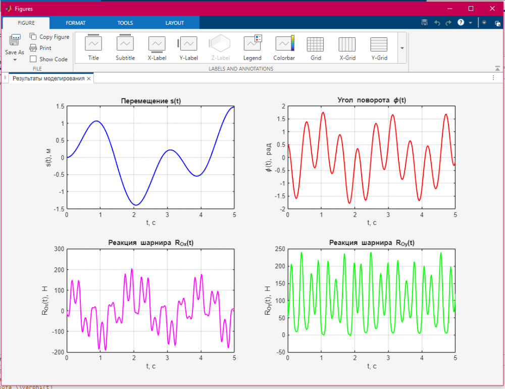• 12. Задавая численные значения параметров и начальные условия: m1=40кг; m2=10кг; R=0,1м; h=0,06м; I0=0,04кг*м2; M0=39,2Н*м; ω=πc-1; t0=0; s0=0; φ0=0,5; s`0=φ`0=0, составить программу решения системы дифференциальных уравнений и на ЭВМ построить зависимости s(t), φ(t), ROx(t), ROy(t).