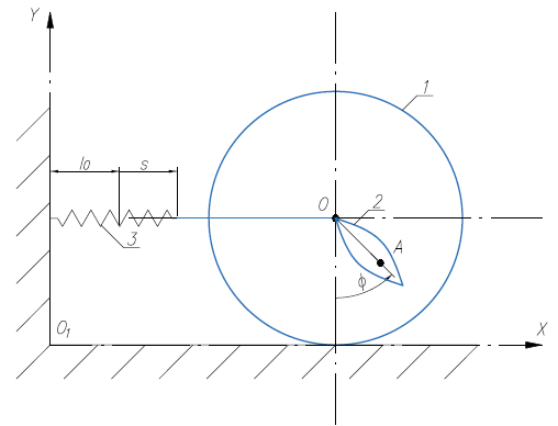 Однородный круглый цилиндр 1 массы m1 и радиуса R катится без скольжения по горизонтальной неподвижной плоскости (рис. 4). К нему приложена пара сил с моментом М=М0cosωt. К оси цилиндра шарнирно прикреплен физический маятник 2 массы m2. Момент инерции маятника относительно оси, проходящей через точку О перпендикулярно основанию цилиндра, равен I0. Центр масс маятника находится в точке А на расстоянии ОА=h. Точка О соединена горизонтальной пружиной 3 с неподвижной опорой. Жесткость пружины равна c, l1 — длина недеформированной пружины.