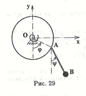 Однородный диск массы m1 и радиуса R может вращаться вокруг горизонтальной оси O, перпендикулярной его плоскости. В точке A к диску прикреплён невесомый стержень AB длины ℓ с грузом массы m2 на конце (рис. 29). Спиральная пружина жёсткости c прикреплена своими концами к диску и к неподвижной опоре. Пружина не деформирована при φ=φ0. Момент сопротивления в шарнире A равен