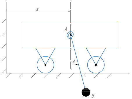 • 2. Считая, что тележка движется по закону s=β*sin(γt) и при этом с=О и k=О, составить дифференциальное уравнение движения точки В относительно подвижной системы координат, введенной в п.1.