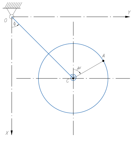 • 1. Ввести подвижную систему координат, начало которой совпадает с точкой С, а оси движутся поступательно. Считая φ(t) и ψ(t) заданными функциями времени, найти абсолютную скорость и абсолютное ускорение точки А. Изобразить на чертеже составляющие векторов vабс и ωабс.