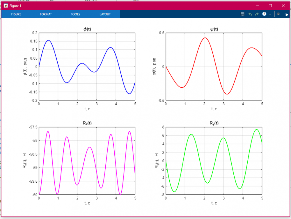 • 12. Задавая численные значения параметров: m1=2кг, m2=3кг, m3=1кг, l=1м, r=0,5м, c=10Н*м и начальные условия: t0=0, φ00=0, φ0`=0,5с-1, ψ0`=-0,5с-1, составить программу решения системы дифференциальных уравнений и на ЭВМ построить зависимости φ(t), ψ(t), Rx(t), Ry(t).