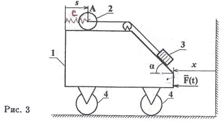 Тележка 1 с четырьмя колесами 4 перемещается по горизонтальной плоскости без скольжения. На тележке находятся цилиндр 2 и груз 3, соединенные гибкой нерастяжимой нитью (рис. 3). Цилиндр катается по тележке без проскальзывания. Цилиндр 2 и колеса 4 представляют собой сплошные однородные диски, имеющие радиусы r2 и r4 соответственно. Массы тел 1—4 равны m1, m2, m3, m4. На тележку действует сила F=F(t). Угол наклона боковой поверхности тележки к горизонтали равен α.