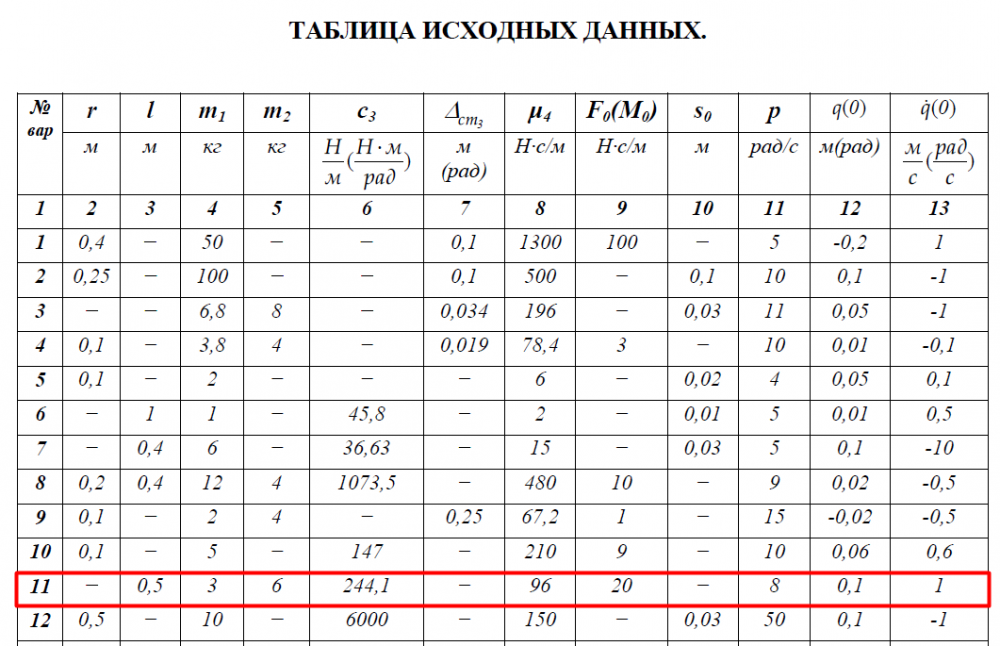 Колебания линейной системы с одной степенью свободы. Авторы Ильин М. М., Пожалостин А. А., Тушева Г. М. Издательство МГТУ им. Н. Э. Баумана 2002 год. УСЛОВИЯ ДОМАШНИХ ЗАДАНИЙ Рассматриваются малые колебания механической системы с одной степенью свободы около положения устойчивого равновесия. Механические системы представляют собой плоские механизмы, расположенные в вертикальной плоскости и состоящие из твёрдых тел, нитей, демпферов и упругих элементов. Необходимые числовые данные приведены в таблице и, где это необходимо, на схемах задач. Для всех вариантов на схемах задана обобщённая координата q(t) , отсчитываемая от положения равновесия в невозмущенном состоянии, а в таблице - соответствующие ей начальные условия.