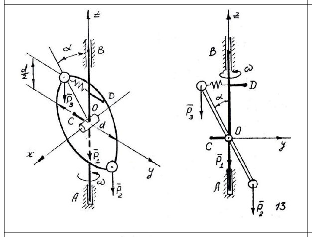 Угол α отклонения тела от вертикали и натяжение пружин. 2. Составляющие полных реакций (статические плюс динамические) подпятника A и подшипника B, то есть величины xA, yA, zA, xB, yB . (Пружины не напряжены при угле α = α°, значение которого приводятся в разделе II \"Исходные данные\") Вариант \"б\". При угле α = α° (то есть вместо пружин следует поставить жёсткий стержень) определить: 1. Составляющие динамических реакций подпятника А и подшипника B при заданном угле α. 2. Вес грузов PC, PD и PE (материальных точек), которые надо разместить в точках C, D и E крестовины так, чтобы динамические составляющие реакций подшипников были равны нулю, то есть, чтобы система была динамически уравновешена.